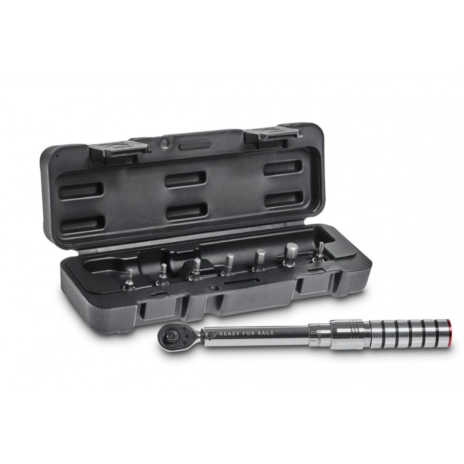 Descubre en Escapa las herramientas perfectas para poner al día tu bicicleta. El juego de llaves dinamométrica Cube RFR Drehmoment Set 7 piezas es de alta calidad con cuadro de 1/4". El par se puede ajustar de 2 a 15 Nm, mientras que un mecanismo de clic muestra el ajuste del par. Con juego de puntas de 7 piezas compuesto por hexágonos 3/ 4/ 5/ 6/ 8 / 10 mm y llave allen redonda 25.